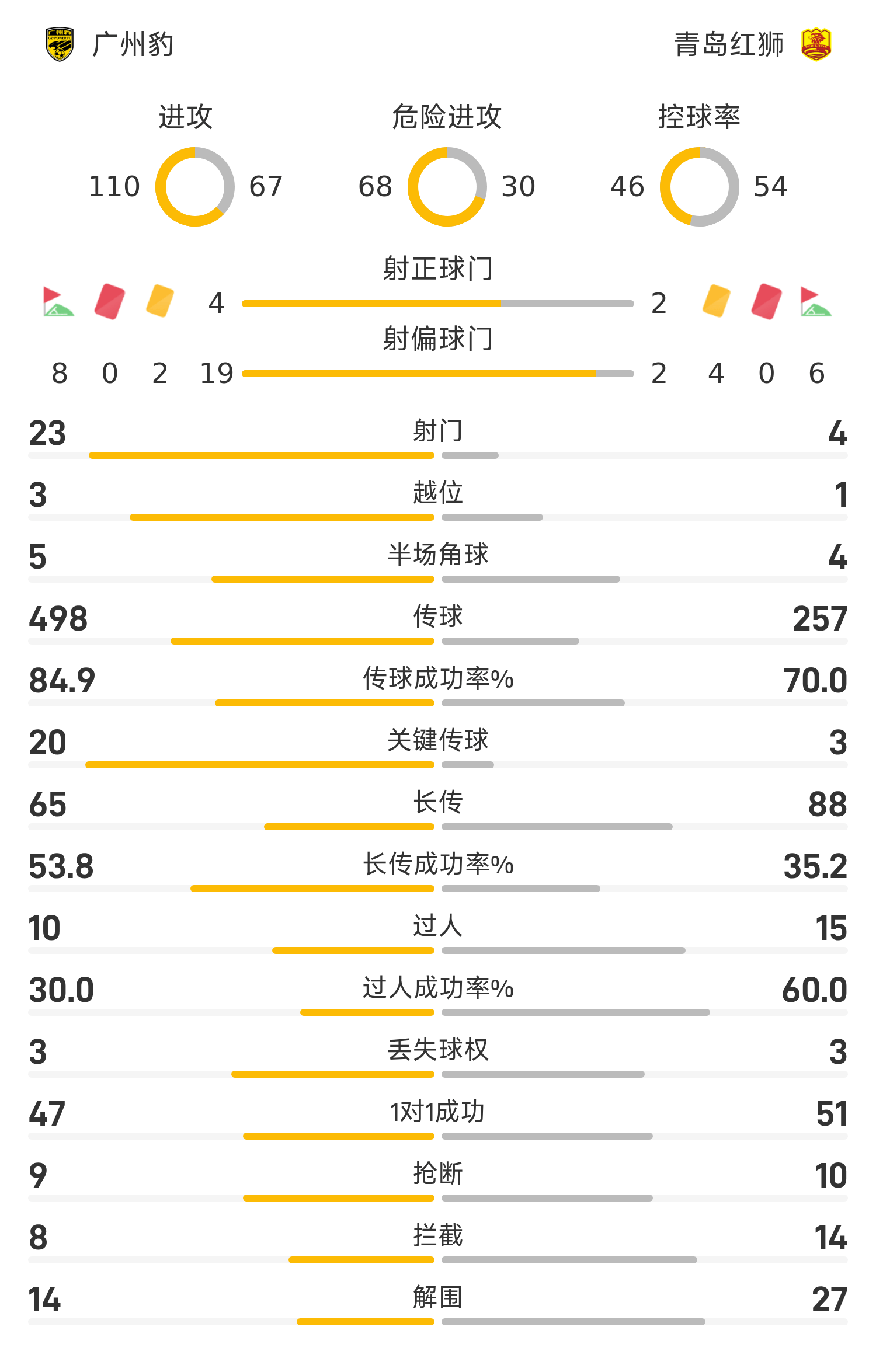 广州豹首发阵容:45-薛思博;3-韩轩(74’2-陈国良);15-邓彪;25-王建明;11-尼康;29-单鹏飞(46’27-吴星宇);37-商隐;34-候煜(66’9-夏达龙);26-马俊亮(46’20-罗萨);7-卡洛斯;38-涂东旭